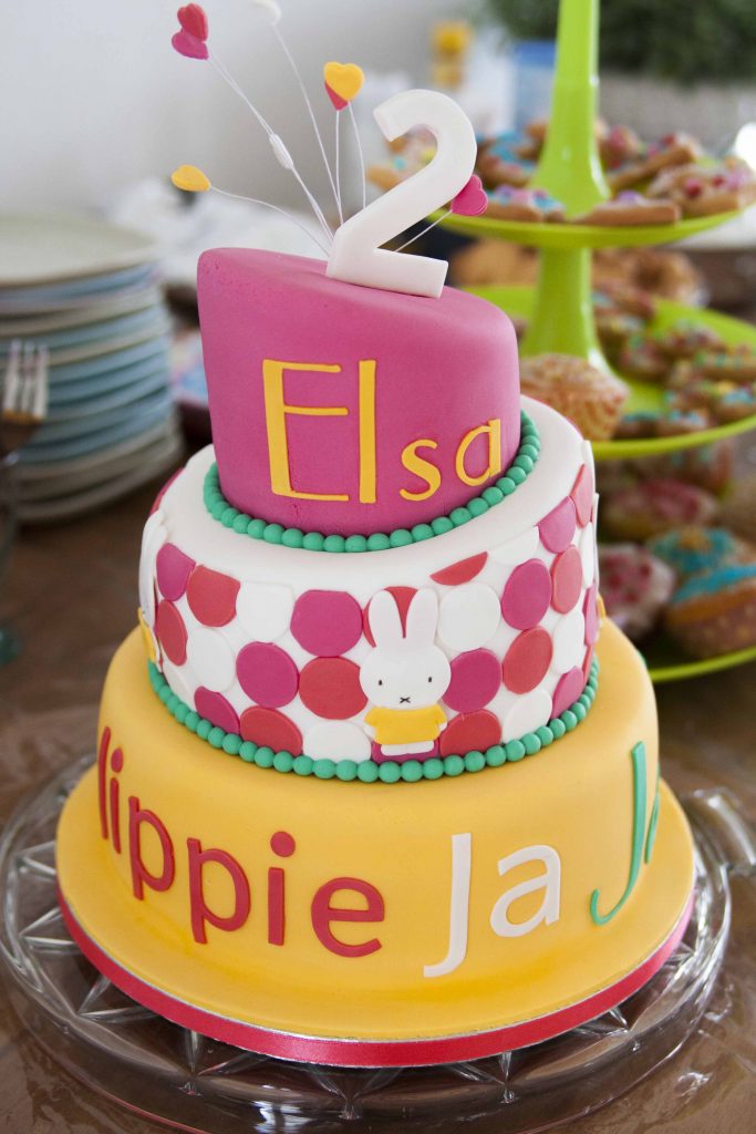 Afgelopen weekend is onze dochter 2 jaar geworden – ja het is een cliché – maar wat vliegt de tijd. Twee jaar geleden lag er een klein meisje op mijn buik. Kort daarna keken twee mooie ogen mij aan, de wereld in. Ze is op 31 januari jarig samen met prinses Beatrix en ik ben op 30 april jarig samen met prinses Juliana. Zoals mijn man zegt, twee ‘koninginnen’ in huis. Nu loopt er een vrolijke peuter rond, klets heerlijk op haar eigen manier. Ontdekt de wereld met veel plezier en als je dan twee word. Dan maken we er mooi ontwerp van, je word maar één keer twee. 😉 Hmmm ja wat zullen we dit jaar eens doen? Iets met ‘twee’, al snel kwam de tekst in mijn hoofd: ‘Jippie ja jee!, ik ben twee’. Maar dan komt de typografie aan te pas, heerlijk om te doen. Spelen met letters blijft iets magisch, taartje erbij, vrolijke kleuren en ontwerp is af. Helaas niet de tijd meer om een echt letterpress kaartje te maken. Maar dat mag de pret niet drukken, wat het is toch fantastisch om kind te zijn! Wakker worden, ontbijtje van papa op bed, naar beneden en dan zie een groot cadeau! Haar eigen keukentje, een grote hit. De dag erna haar feestje en daar hoort een taart bij! Eveline (mond vol taart) maakt heerlijke taarten, niet alleen heel lekker, het zijn net kleine kunstwerkjes. Als ontwerper onwijs gaaf, dat zij een ontwerp van mij tot een heerlijke taart kan maken. Zoals je heeft ze er een prachtige variatie op gemaakt. Onze dochter is gek van Nijntje op dit moment en komt ook terug in de taart. Daarnaast heeft ze de bruidstaart van Boy en Inez ook gemaakt. Elke taart is een feestje. Op haar website zie je wat ze allemaal maakt.