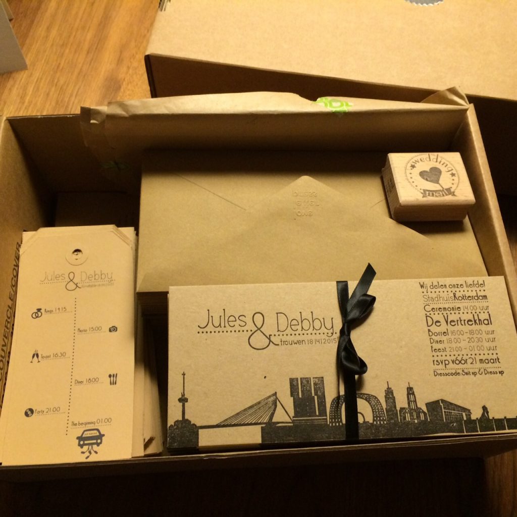Een nieuwe trouwkaart letterpress met de skyline van Rotterdam. Weer een andere stad, dan New York, Amsterdam of Utrecht. De Skyline kaarten blijven als ontwerper heel bijzonder om te mogen drukken. Daardoor wordt het een mooie persoonlijke en unike kaart. Helemaal naar wens van het bruidspaar. Ze hebben een trouwstijl gekozen om ook een ceremoniemeesterbrief, time label en weddingmail stempel te gebruiken. Een mooie persoonlijke touch.